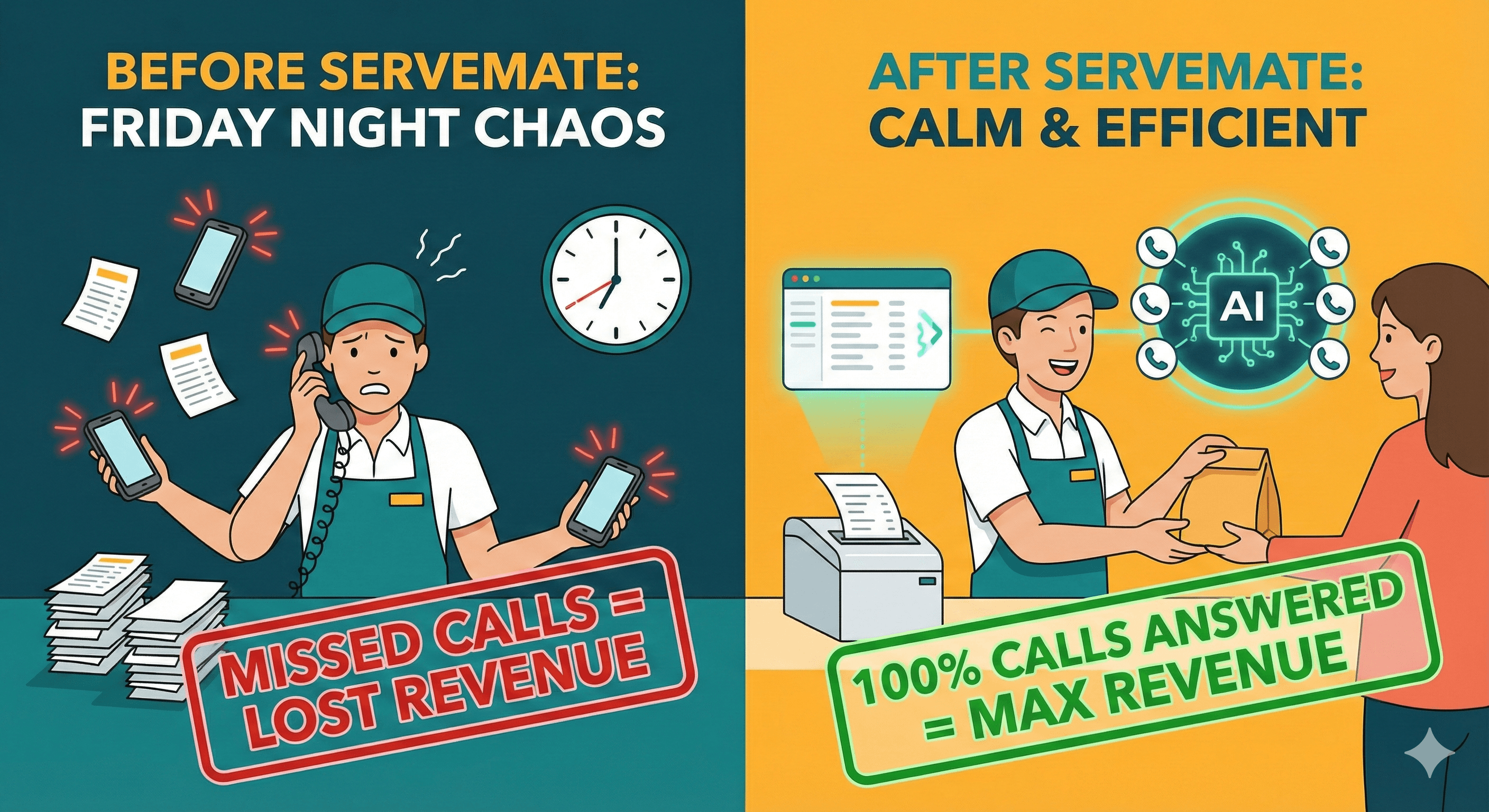 The Fix: ServeMate handles the queue instantly. Your staff can focus entirely on packing food and managing drivers, while the AI handles the orders politely and efficiently.